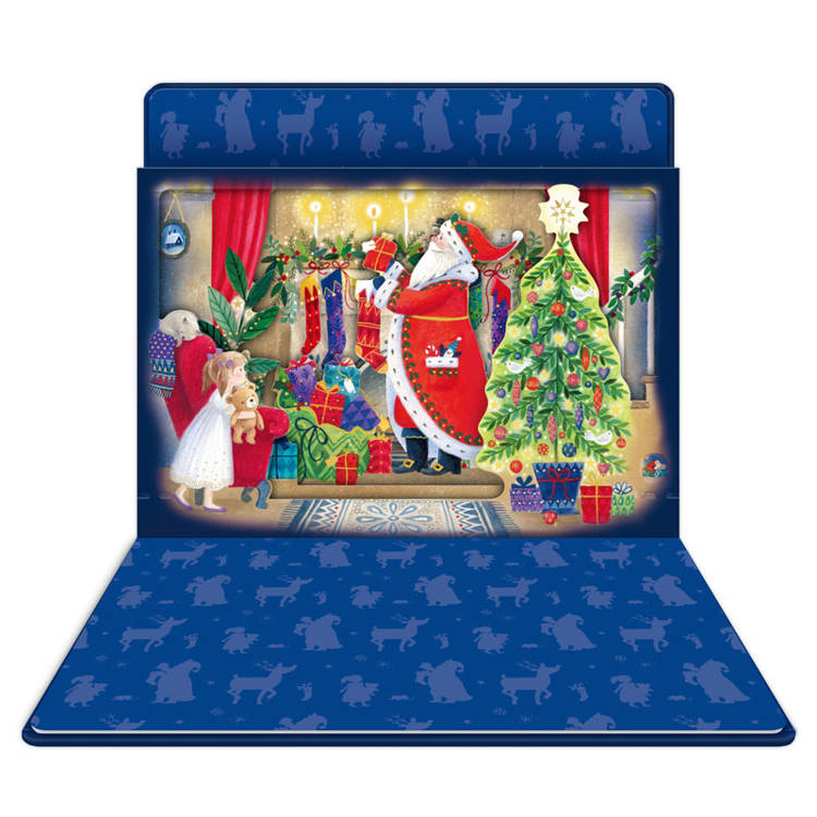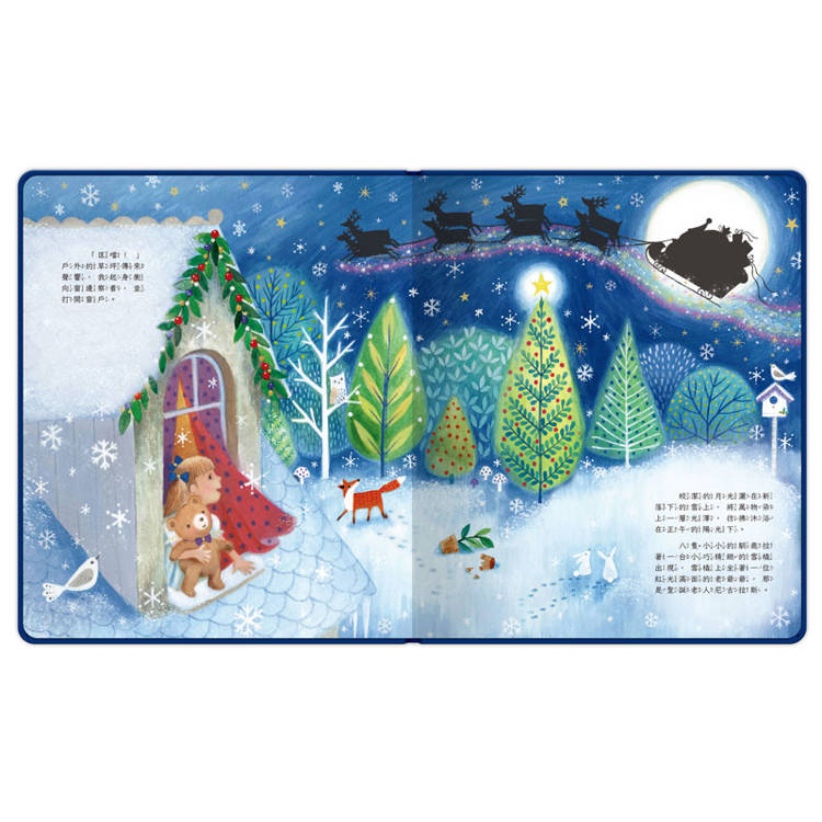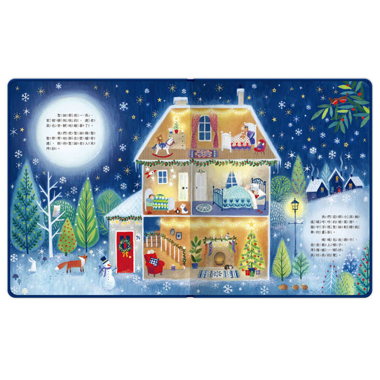 書內附上一頁精緻的立體紙雕,展現聖誕老人送禮物的經典場面。繪圖細緻、色彩豐富,將充滿想像力的文字描繪的夢幻畫面具體呈現在眼前,擺在桌上、床頭櫃也可以成為日常生活中美麗的裝飾。