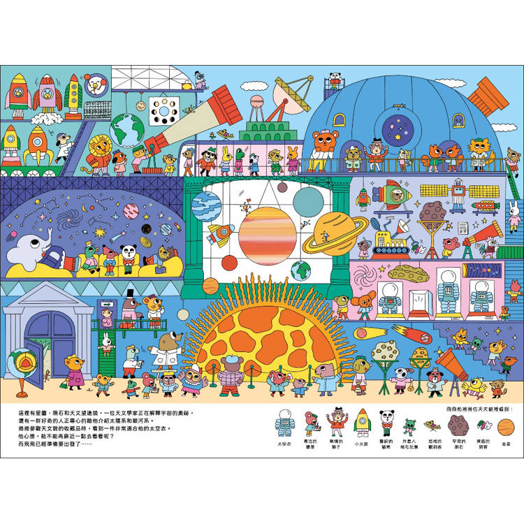 故事設計是以「穿越時空、場景跳躍」的方式展開,每一頁都是一個全新的世界,從熱鬧的街道、奇幻的恐龍大草原,到五彩繽紛的海洋世界。大人可以鼓勵孩子專注觀察,並說出自己的發現,譬如街道上有書店、咖啡廳、公車站;在外太空可以看見地球、火箭、外星人;或是在昆蟲村莊裡,可以看見螞蟻、毛毛蟲和蚯蚓……透過親子共讀,孩子也能得到許多趣味認知。
