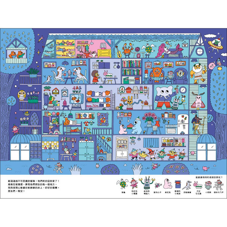除了尋找指定物件,孩子也能透過觀察圖畫,發現隱藏的角色,創造屬於自己的故事。譬如童話世界裡有三隻小豬、薑餅人、穿長靴的貓…還有誰呢?最後,當飛飛和捲捲終於回到自己的家,舒舒服服的躺在被窩裡回味一整天的奇遇。可是故事還沒完呢,一路上的奇妙生物也跟著他們回家,你發現了嗎?