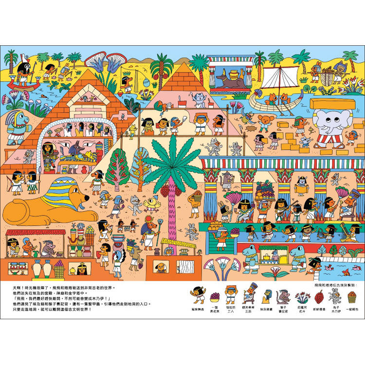 故事中的場景彼此呼應——在天文館搭上火箭,下一站來到外太空;接下來被吸進黑洞,來到未來世界;當他們搭上時光機準備回家,竟陰錯陽差去到神祕古埃及;在地底洞穴土裡藏著恐龍化石,果然下一站就來到恐龍大草原……圖畫中隱藏的線索讓閱讀更有趣,也讓孩子更期待下一頁的驚喜!