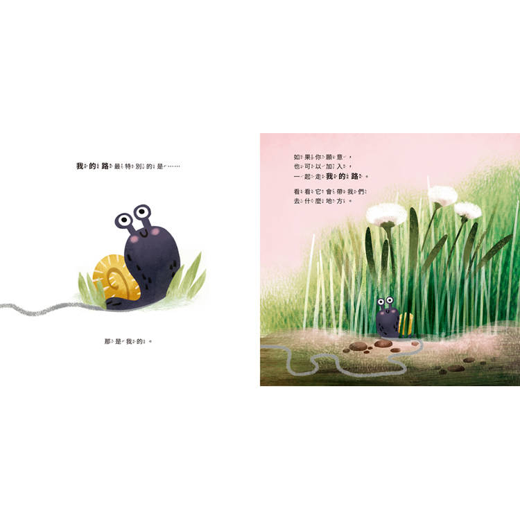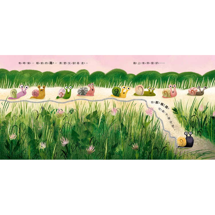 小蝸牛,走了一趟自己的人生路徑:或平坦、或崎嶇:或熱鬧、或孤單:或充滿盼望、或走投無路……但不管前方的路徑如何,小蝸牛都懷抱著相同的信念:「每個人的路都不同。每條路都很特別。所以,選擇自己的路……持續前進!」就像《内在成就》一書的作者愛瑞克所說的:「每個人都是獨一無二的存在,有自己的使命和旅程要走。」