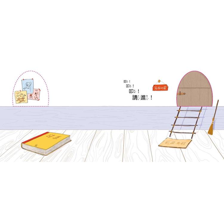 本書內頁有三處開洞,呈現了小老鼠蘇西的家門口。洞口忽大忽小的視覺變化,相當有趣。橫向扁長式的開本,也呈現了動作的連續性與時間的流動性。