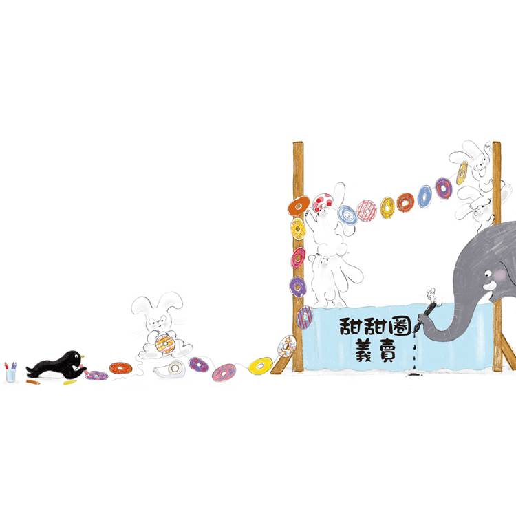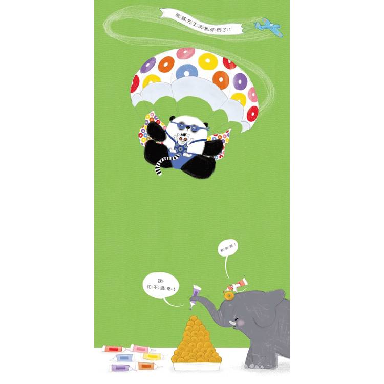 一開始,告示牌上的「甜甜圈義賣」,便馬上揭示了這個故事是建構在過往溫暖又良善的基調上。而「超級熊貓先生」也果然以英雄姿態登場,先是幫助企鵝快速運送堆疊得像小山一般高、剛做好的甜甜圈;接著騰空而降協助忙不過來的大象和老鼠,用最有效率的方式為甜甜擠上糖霜;最後再以蜘蛛人倒吊的方式出現,幫助兔子夥伴為甜甜圈撒上閃亮亮的彩色糖粒。