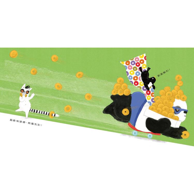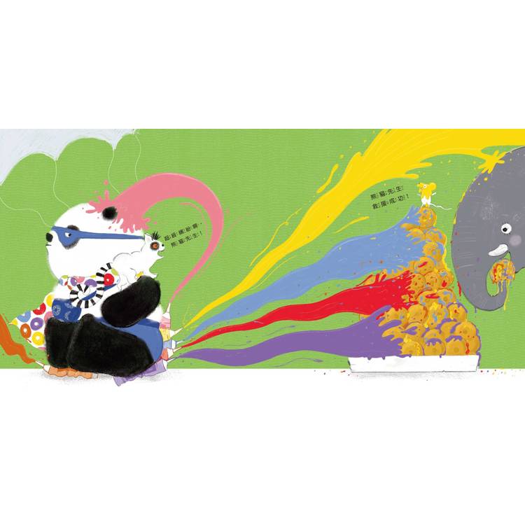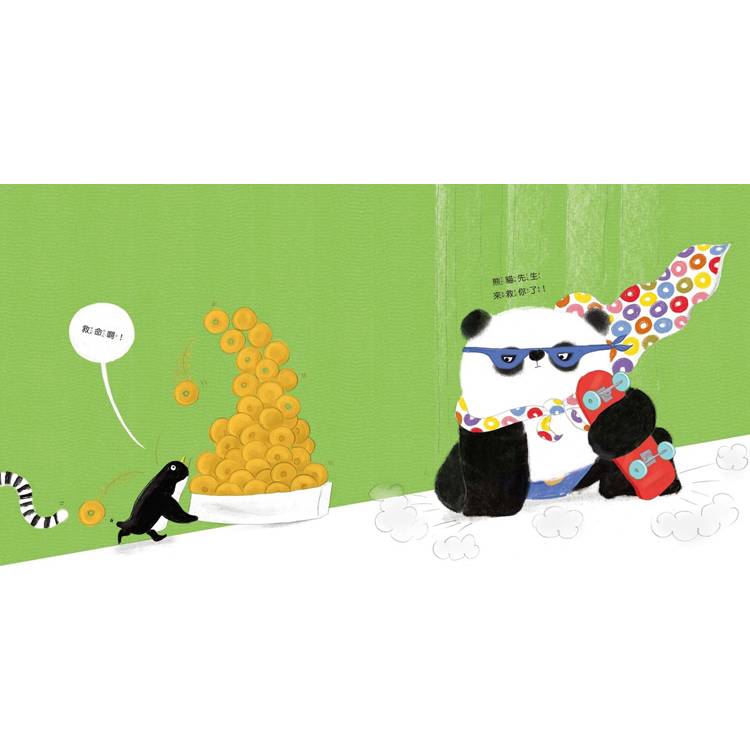 冷靜的熊貓先生身旁總圍繞著逗趣又「很」忙的動物們,一靜一動,形成了強烈的對比也多了記憶點,到底動物們在忙什麼啊?也讓親子在閱讀中自然而然的進入故事中,這次熊貓先生化身成Super Man,會發生什麼事情呢?