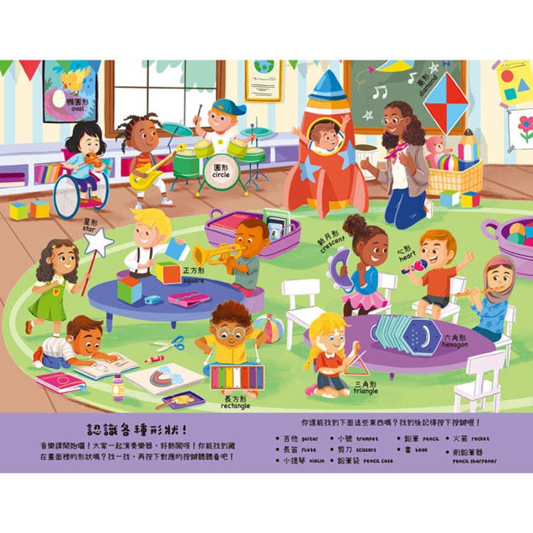 這本書不只是音效書,更結合了有趣的「找找看」遊戲!孩子可以先觀察每一頁的場景,再從中找出右下角列出的單字。找到後按下對應的按鍵,不僅能認識物品,還能聽見它的聲音!透過遊戲的互動,小朋友能在樂趣中培養專注力、觀察力與耐心。