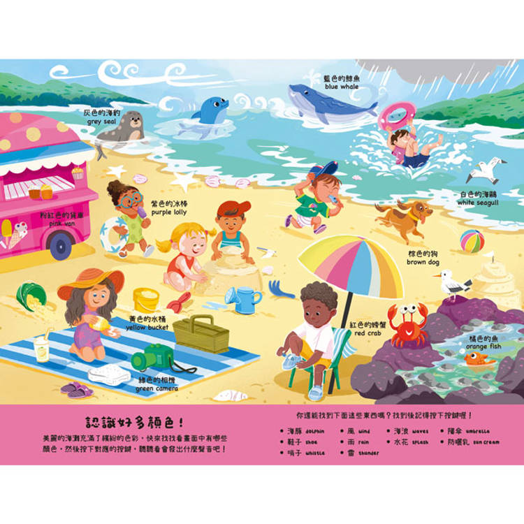 紫色的冰棒purple lolly、白色的海鷗white seagull、紅色的螃蟹red crab、灰色的海豹grey seal、黃色的水桶yellow bucket……