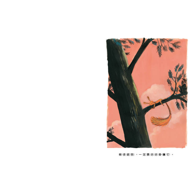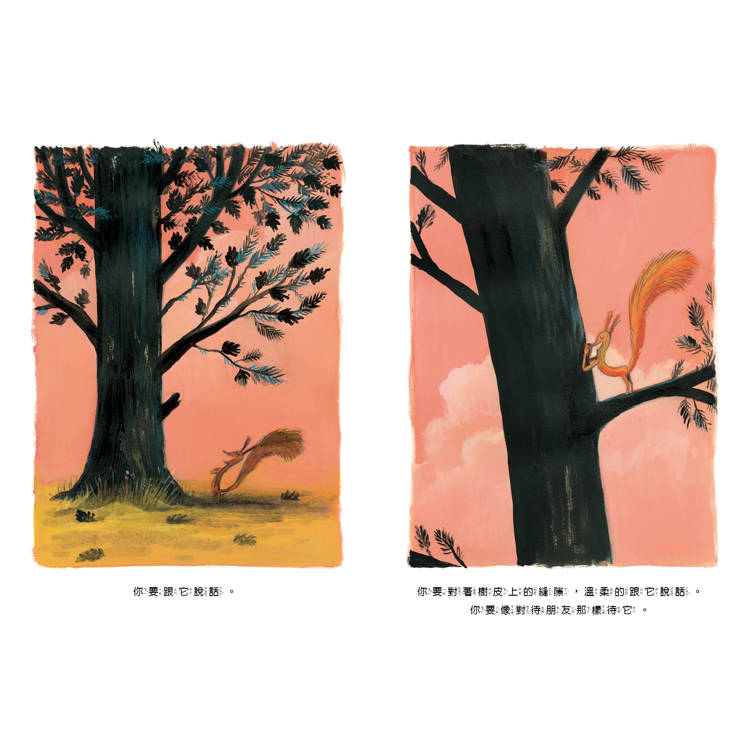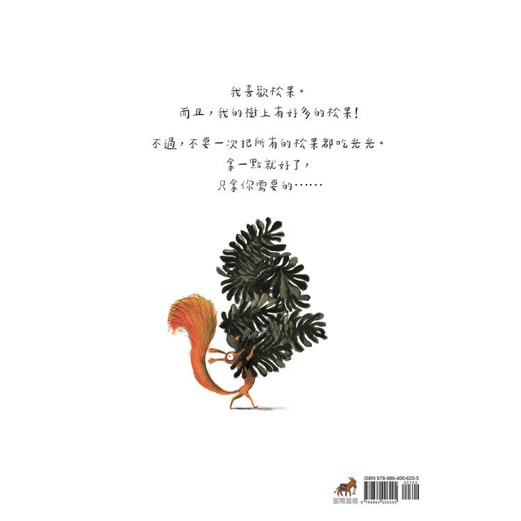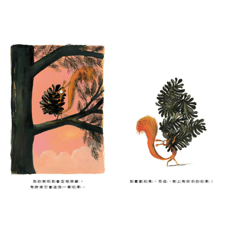 松鼠對待他的樹,就像待朋友那樣。雖然他很喜歡樹上的松果,但是不能太貪心,一次只要一點點就好。先拿一點點,再拿一點點。如果樹上沒有松果了,也沒什麼大不了,因為樹上還有很多針葉⋯⋯。