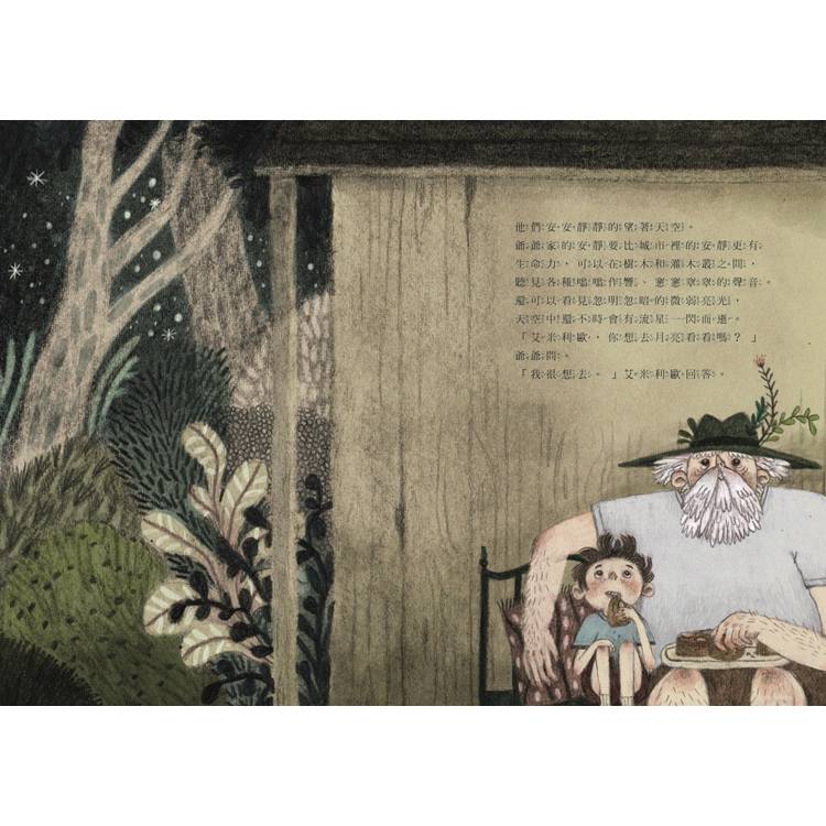 接著,爺爺問艾米利歐想不想去月亮看看?他們準備好就出發,沿著森林小徑前進……走著走著,星星似乎變得更近了。難道爺爺知道通往月亮的祕密通道?