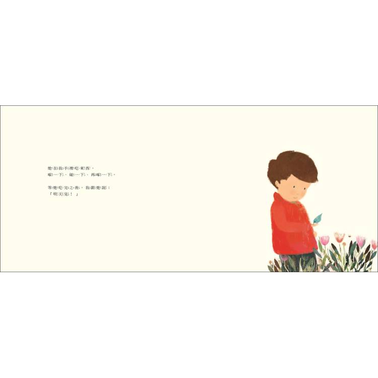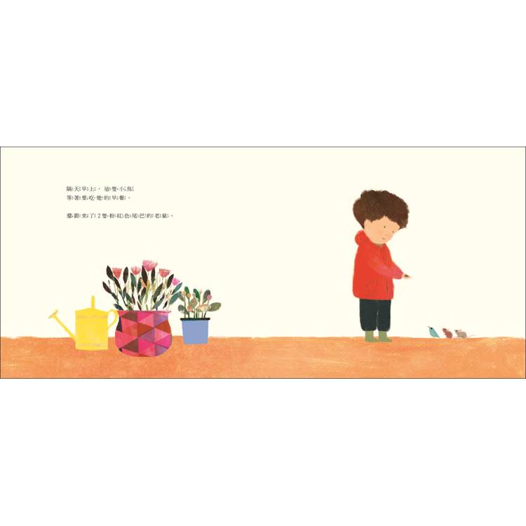 有一天,一個男孩遇見了一隻小鳥,還分給她一些早餐。