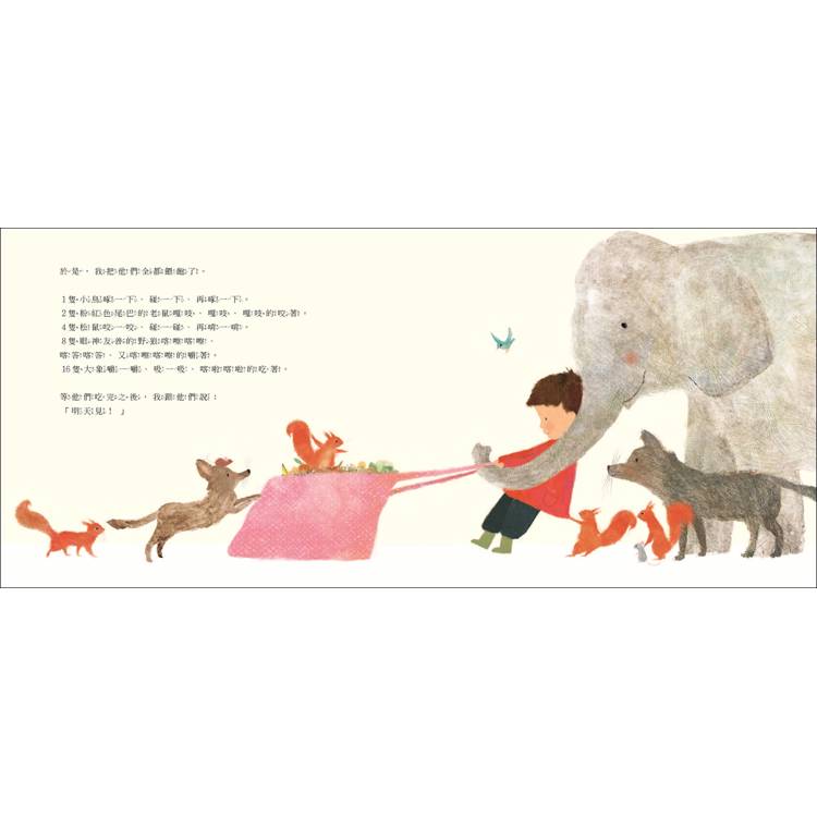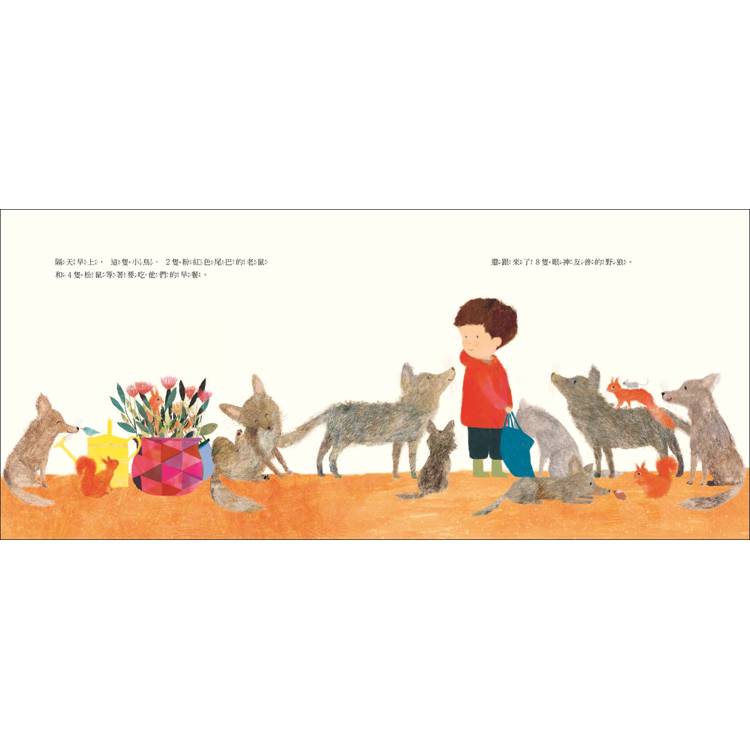 ★「這本書主要使用淡雅、低飽和的色彩,偶爾點綴幾個較為鮮明的亮色,讓畫面中的重點自然跳出來,例如:男孩的外套——這是一種巧妙的方式,讓讀者始終把注意力放在故事的核心角色身上。背景的使用也相當節制,留有大量留白,使視線能集中在動物以及他們圍繞著早餐所展開的各種小動作上,效果非常好。」~「英國書群網站」(BookMurmuration)