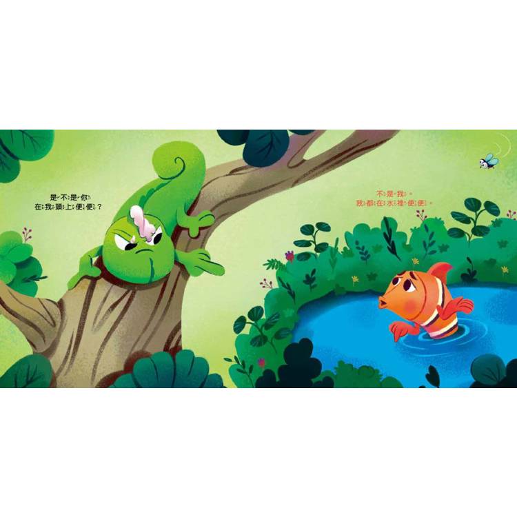故事中的蜥蜴被一坨突如其來「疑似便便的東西」砸中,氣得不得了,於是展開一場又好笑又曲折的「追查真相之旅」。在陪孩子讀這本書時,可以試著從以下幾個方向和孩子討論: