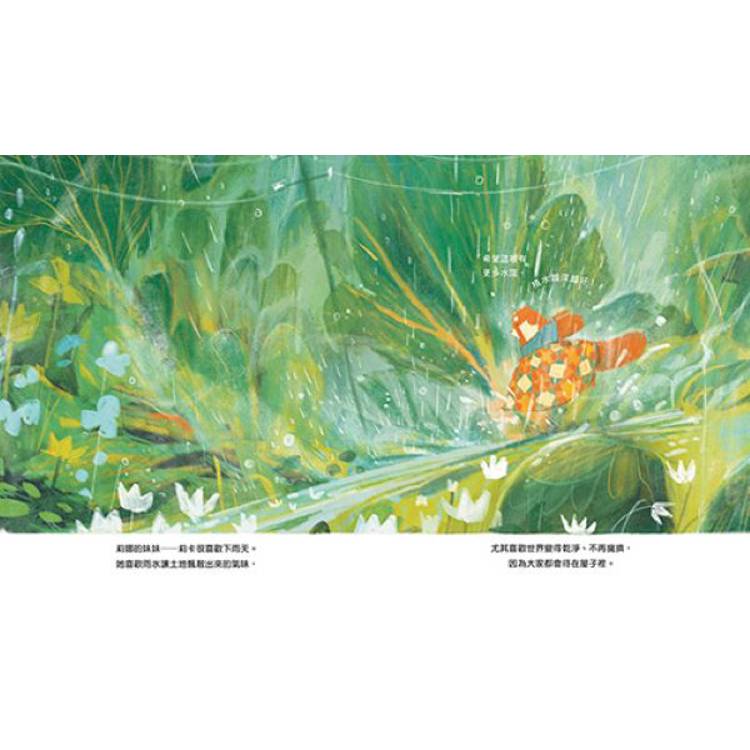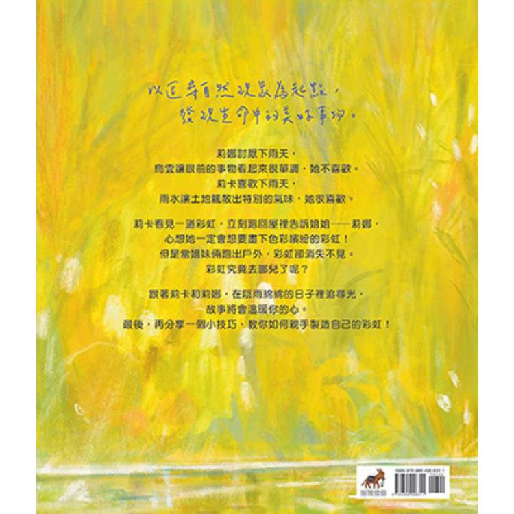 故事從莉娜和她的妹妹莉卡的性格說起,莉娜討厭下雨天,她不喜歡大地被烏雲籠罩,也不喜歡畫具被雨水淋濕;莉卡卻很享受雨天帶來的樂趣,她喜歡大步跨過小水窪,也喜歡雨滴和土壤交織的氣味。面對同一場雨,兩姐妹有著截然不同的心情,但卻有一個可愛的共同點—都把彼此放在心上。當莉卡獨自在雨中玩耍,偶然看見天空出現一道彩虹。她第一個想到的就是:愛畫畫的莉娜一定會想用畫筆把美好的景色記下來,於是迫不及待地想和姐姐分享。
