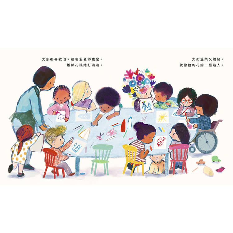 我的朋友大衛,頭上開滿了鮮花。這些五顏六色的花,讓蜜蜂追著他跑,鳥兒也喜歡來停留。大衛溫柔體貼,每個人都好喜歡他,我們總是一起踩水坑、開心玩耍。