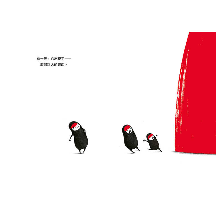 這是個很有趣又詩意的寓言故事,從圖像上,我們甚至看不出這一家主角到底是人還是什麼動物,在視覺上就充滿想像力。故事開始只說:突然就發生了。有一天,那個巨大的東西出現了。讀者隨著主角一家人的視角看去,我們只看到這個巨大的東西的一小角,完全不知道這到底是什麼東西。主人翁說我們不知道它有多高,當時也不知道它有多寬。我們繞不過去,也跨不過去。這個巨大的東西是一個沉默的存在,卻占據了太多太多的空間。於是,我們決定反抗——我們也要變成像它那麼巨大!我們花了很多小時研究,花了很多天討論……後來,我們漸漸忘記了要變成巨大這件事。然後,奇蹟發生了:我們不再對抗,只是自然地生活;我們不再掙扎,只是靜靜地成長。直到某一天,我們發現自己竟然真的變巨大了。而那個曾經巨大的東西,依然在那裡,但看起來已經不那麼巨大了,也已經不再令人窒息。