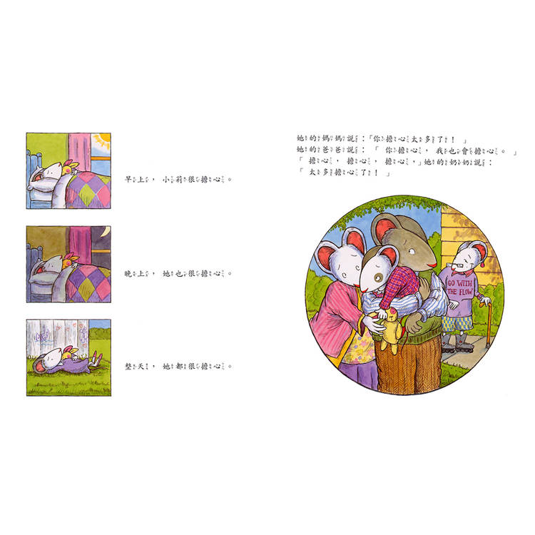 小莉是個凡事都擔心的小孩,擔心爸媽在她睡覺時不見了、擔心屋前的大樹、牆壁的裂縫;萬聖節時既擔心有太多人打扮得跟她一樣,又擔心沒人跟她一樣扮成蝴蝶;生日時既擔心沒人來參加她的生日派對,又擔心準備的蛋糕不夠吃……即使家人都跟她說:「太多擔心了。」小莉的擔心卻在即將上學時盪到最高點,愛擔心的小莉該怎麼辦呢?