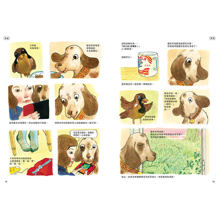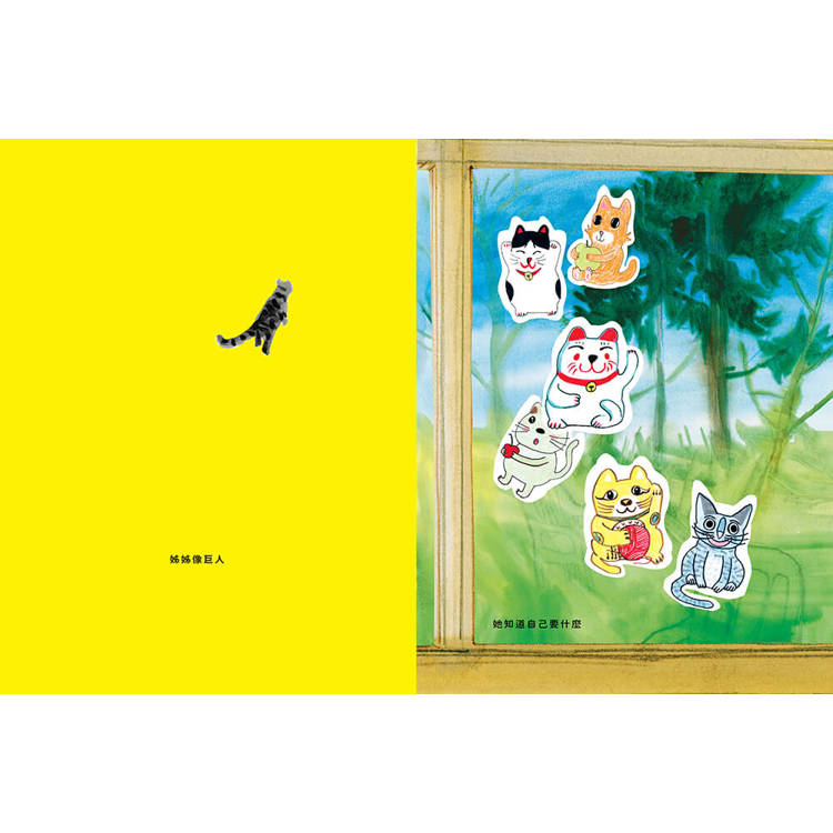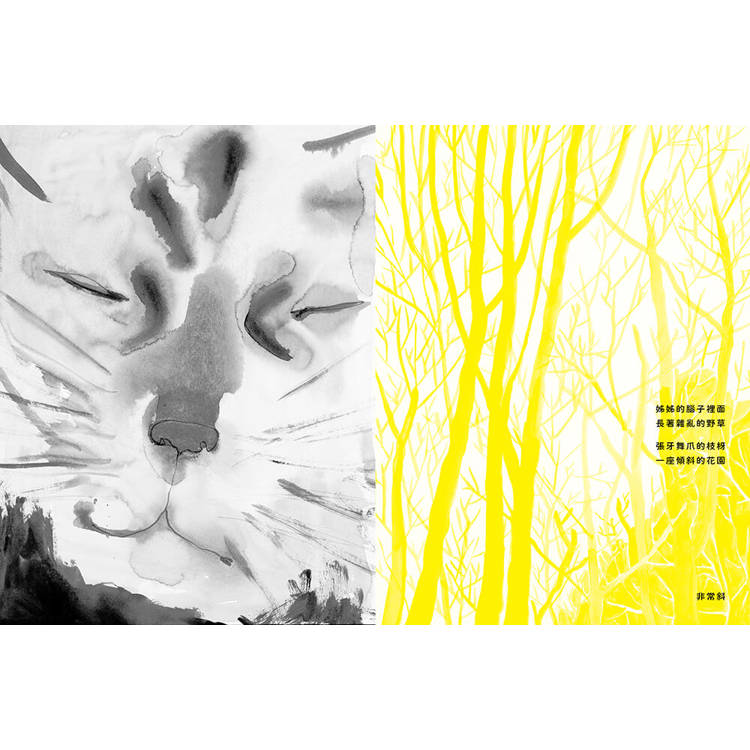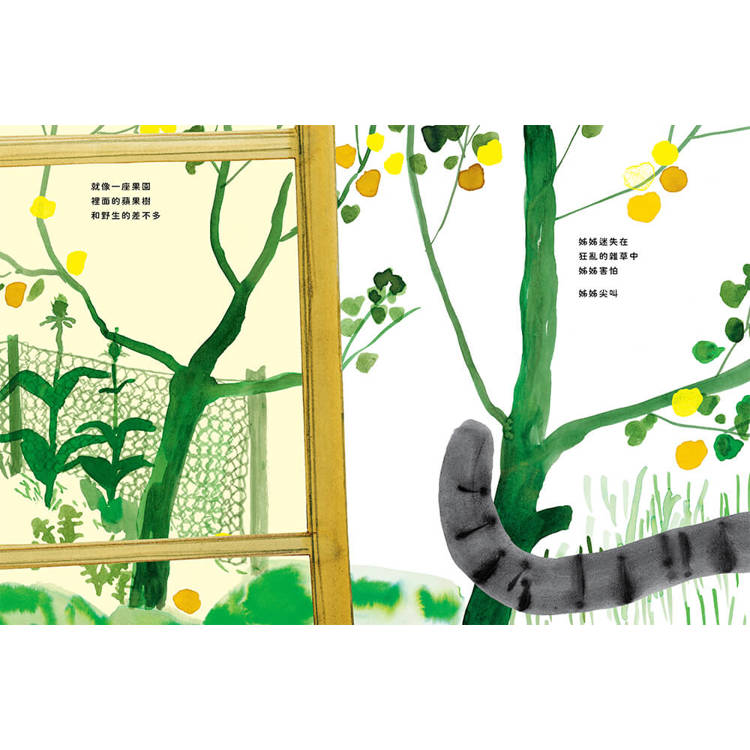 翻開書頁,我們能夠從字裡行間清楚感受到敘事者對「姊姊」的愛、包容、理解,以及想保護她的真切心意。在安・艾珀精心打造的圖像世界裡,我們彷彿跟隨她的畫筆,與畫面中的小貓咪一同深入那座傾斜而荒蕪的花園,時而穿梭在雜亂的草叢間、時而仰躺在鬆軟的土地上,見證這小小祕密基地裡的春夏秋冬與日升日落。