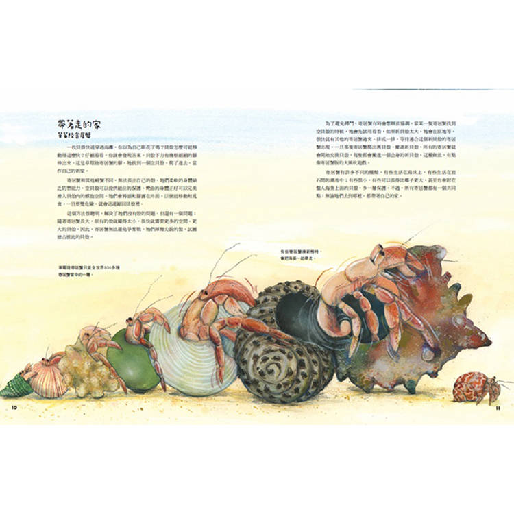 在沙灘上,寄居蟹背著螺殼移動,隨著身體長大,不斷更換更合適的殼;