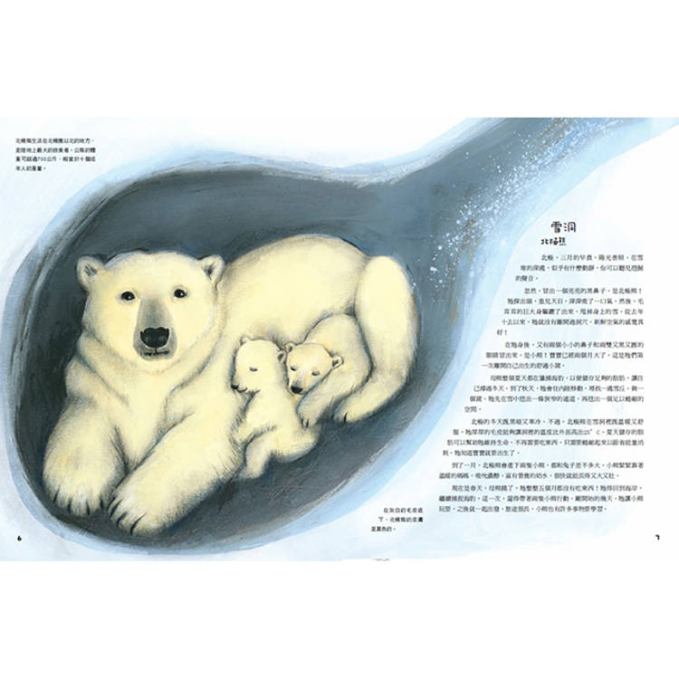 在北極的雪地裡,母熊挖出洞穴,讓幼熊在穩定的溫度中誕生;