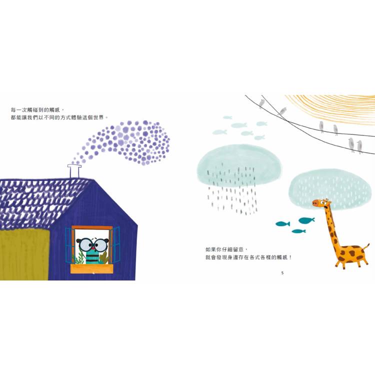 ◆作者以充滿詩意的文字勾勒出日常生活中的各種觸感,繪者將這些觸感以充滿童趣的圖像具體化,讓孩子們能用不同視角發現生活中各處觸覺的存在、激發想像。