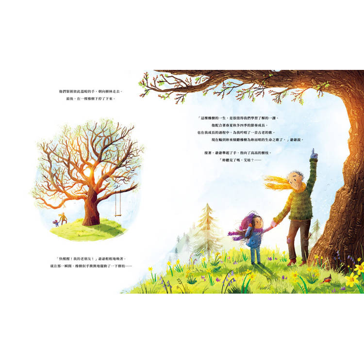 小女孩天真地說她要永遠跟爺爺在一起,爺爺當然很開心,但是也提醒小女孩,如果她一直待在爺爺身邊,就會錯過生命中的其他好風景。於是,爺爺帶著小女孩走進森林,把自己的老朋友——一棵橡樹,介紹給小女孩,展開一段生命教育之旅。