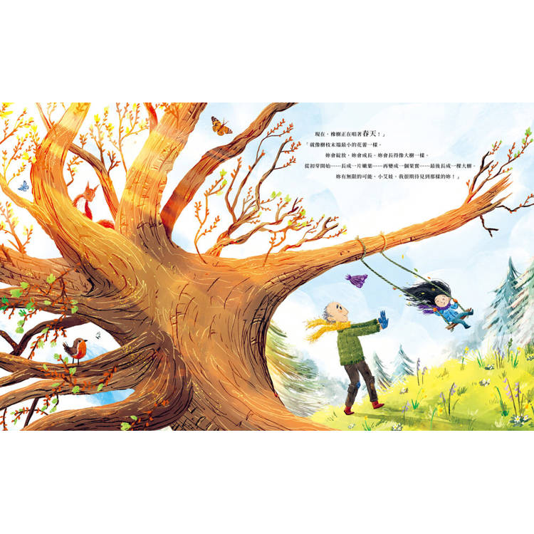 2025/01/09 第一眼被這本繪本吸引,是因為圖。 描繪春天那一頁,陽光從書頁的左上方流洩下來,灑在樹枝上開滿的小花蕾,金光燦爛,小女孩坐在揚起的鞦韆上,紫色的毛線帽被風吹得飛了起來,小女孩髮絲飄揚,轉頭笑看身後幫她推鞦韆的爺爺。這是生意盎然的春天,孩子如花蕾似的,和大樹一同成長。 夏天那一頁,是小女孩坐在爺爺肩上,祖孫兩人在下著雨的森林裡散步。再一頁,橡樹在陽光下閃耀萬丈光芒,巨大的樹型挺拔昂揚,是生命力最旺盛的時期。 秋天的橡樹套上了金黃色的舞衣,在風中翩翩起舞。小女孩對於落葉表現出了不捨,甚至說出了「不想要跟綠橡樹說再見」這樣的話。這是一般人在面對「失去」時的不解與抗拒,卻也是成長無可避免的必經。 冬天來臨時,爺爺生病了,老橡樹也靜靜地傾倒在寒風裡。該是說再見的時候了…… 每一個結束,都是另一個全新的開始。小女孩在爺爺的引導下,種下了一顆小小的橡樹果實,期待下一個春天的來臨…… 然後,小女孩長大了。春、夏、秋、冬,再一個春夏秋冬。我們看到長大的小女孩當了媽媽,她帶著一個小男孩來看橡樹…… 翻閱著每一頁如詩的文、如畫的圖,經歷四季,看見人生縮影。讀的時候,心情有些微的波動,不是驚滔駭浪,而是靜靜的平和安定。這就是大自然啊!這就是人生啊! 喜歡這本小小的繪本,還有一個很私人的緣由。一年多前,我最最摯愛的父親離開了。在經歷過一段很長時間的痛苦、失眠後,我選擇了走進大自然。因為我住得離陽明山很近,於是,我一有空閒便往山裡去。隨身帶著父親的相片,好似父親陪著我在山裡走。走著走著,眼淚被陽光曬乾了,心裡的悲傷烏雲也被風吹散了,在藍天裡、在樹影裡,我隱約見到父親熟悉的笑臉。我對著父親的照片說:「爸,不管您在哪裡,都希望您很好。我也會好好的……」 「所有你失去的東西,那些你所愛的人和事物,其實從未消失。它們永遠存在你的心中,變成你的一部分…… 永遠活著。」