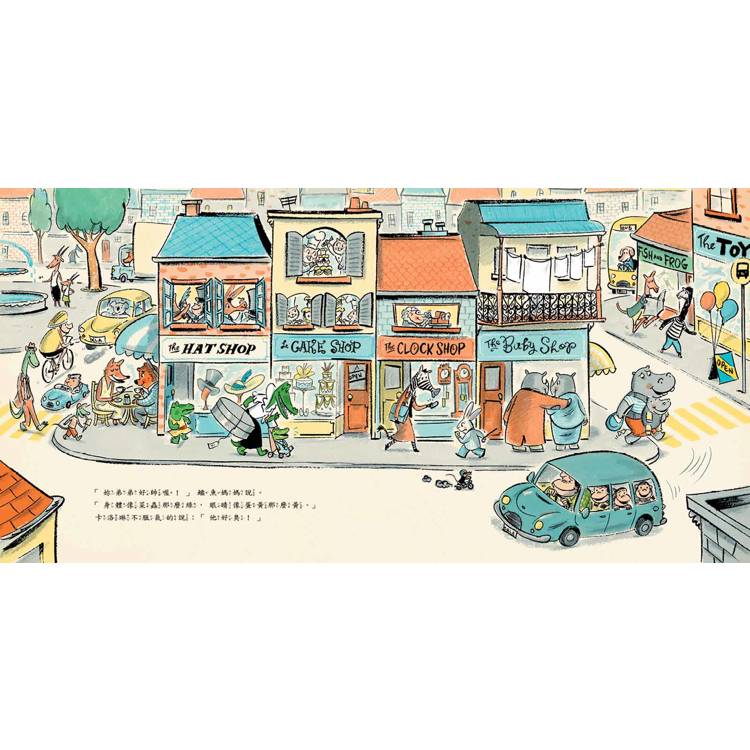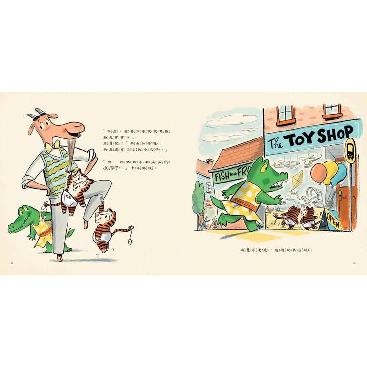 圖畫書是由文字和圖像一起來說故事的。這本書的圖像中藏有許多耐人尋味、有趣的細節。譬如:站在嬰兒店前的犀牛先生、犀牛太太想要買一個寶寶嗎?河馬媽媽背在胸前的河馬寶寶腳上繫著一個標籤,難道河馬寶寶不是河馬媽媽親生的,而是從嬰兒店買來的?又譬如:兩隻小老虎的頑皮並不是牠們踏進玩具店大肆破壞才看得出來,一出場,一隻老虎用手抓著山羊的鬍鬚,另一隻老虎單手吊掛在山羊的腿上,就可以看出牠們的淘氣了。