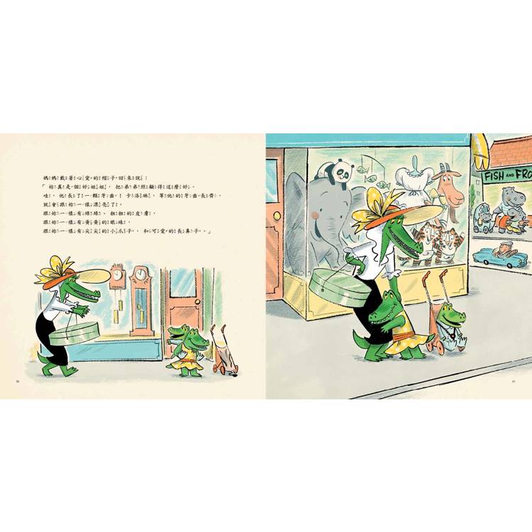 小孩有敏銳的觀察力,同時也是模仿高手。這點從鱷魚姊姊的身上可以看出來。是鱷魚姊姊先發現鱷魚寶寶會流口水的。看到媽媽拿帽子去換,鱷魚姊姊也學媽媽,將「不適合」的寶寶拿到嬰兒店換。鱷魚姊姊知道媽媽喜愛什麼,當她想要換掉寶寶時,是按照媽媽的喜愛來選擇的。她問熊貓寶寶要不要吃魚或青蛙?也是因為她看媽媽餵寶寶吃魚和青蛙。父母的一言一行,小朋友都看在眼裡,所以說父母是孩子最初的老師。