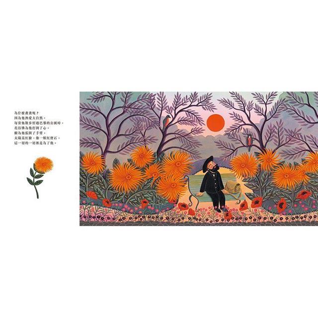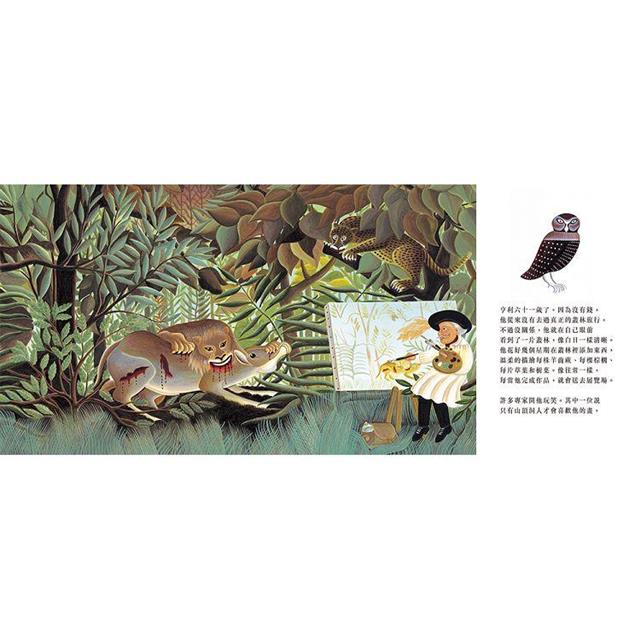 的確,這本書介紹的是一位非常特別的素人畫家,作者簡約的文字除了描述盧梭從中年自學畫畫,受專家嘲諷,仍努力不懈,終於獲得肯定外,更用充滿詩意的文字,表達盧梭的內心世界,尤其是他對大自然的熱愛,以及孩子般純真不受侷限的眼光,他所畫的不只是事物的表象,而是竭盡所能,把自己的想像、記憶和熱望都寄託在畫裡。