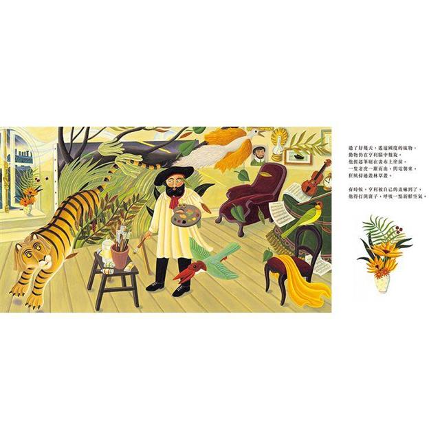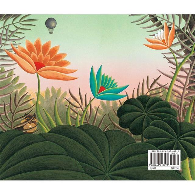 第一次看到這本圖畫書,就被書裡的圖畫深深吸引,因為畫中的色彩、線條既描繪現實事物,又刻畫一個非現實的世界,彷彿有自己的生命,在頁面上恣意伸展、擺動,跳起舞來。雖然繪者雅曼達.荷爾以亨利.盧梭的畫作為參考,把盧梭的作品巧妙安排在每一幅畫裡,卻又設法跨越時空的隔閡,使盧梭的作品看來更為可親,讓讀者自然而然的進入畫裡。