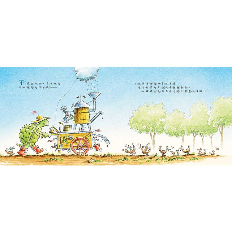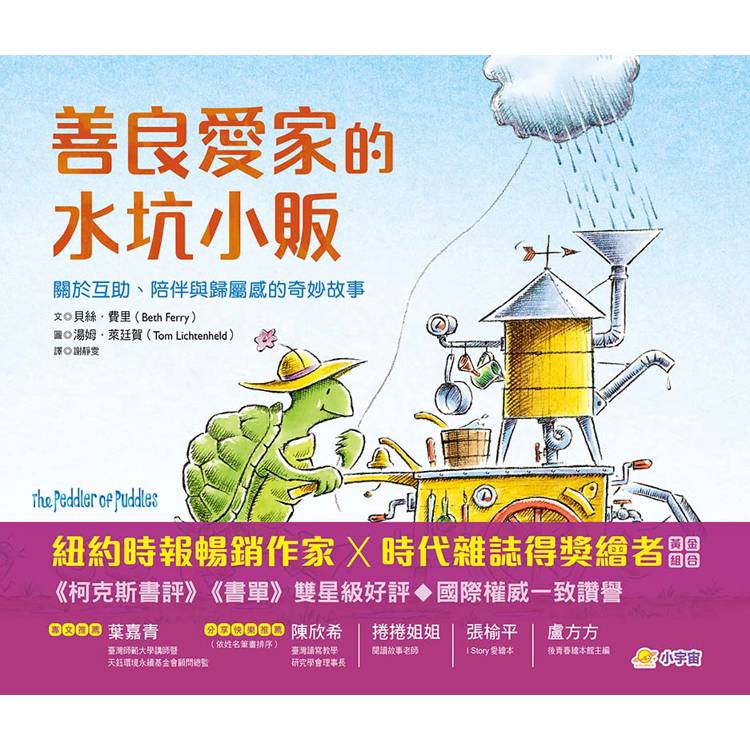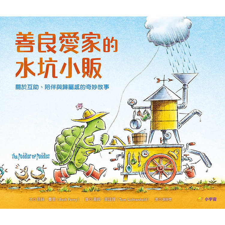 在這本溫柔詩意的繪本中,我們遇見了一位與眾不同的小販,一隻推著攤車,緩緩走過森林、田野與海岸的烏龜。他不賣糖果,也不販賣玩具,而是為這個世界帶來一個又一個恰到好處的水坑。