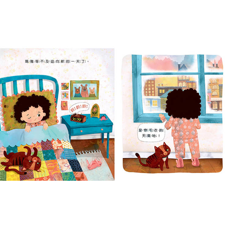 這則故事最動人的地方,在於故事才開場不久,瑪雅就遇到了生活中的挫折。她原本滿心期盼在天氣剛剛好的時候,穿上自己最喜愛的毛衣,沒想到才穿上寶貝毛衣不久,毛衣就被貓咪拉到綻線。不過瑪雅非但沒生氣或責怪造成這種場面的貓咪,還告訴自己……毛毛很開心耶,那我也很開心。瑪雅正向看待事物的心理韌性,並且更進一步悉心觀察留意身旁人事物的反應與需要,使她所在的世界充滿善意的互動,到後來車上的老婆婆發現瑪雅冷得發抖,也主動幫助瑪雅,這種愛的循環真是令人讚嘆又感動呢。