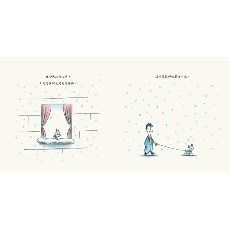 在這個故事裡,奇奇想為好友小歐找到一份「完美的禮物」。他翻箱倒櫃,走出家門,在雪地裡四處尋找。他抬頭望著天空,低頭凝視腳邊的雪花與影子,用盡全力想找到那個最特別、最能表達心意的物品。