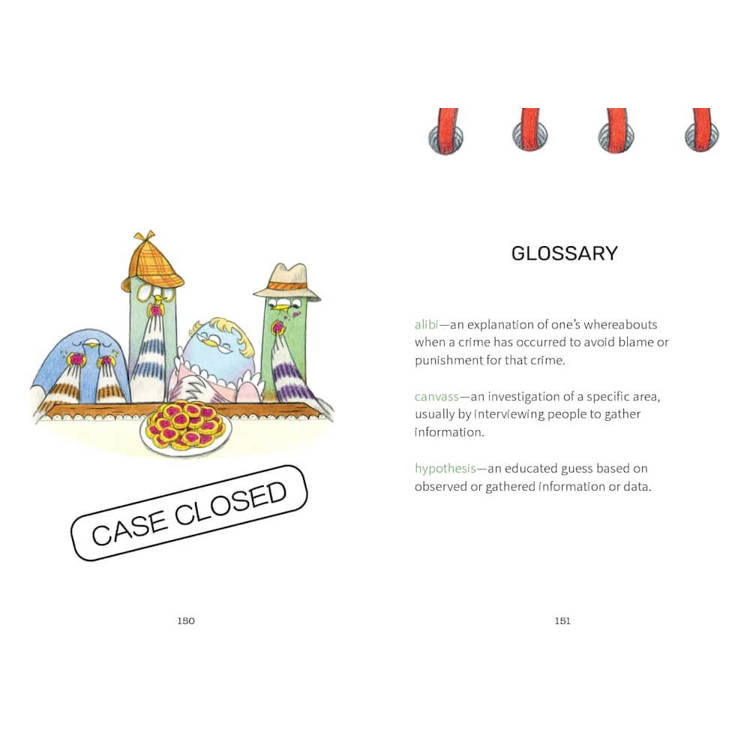 由於圖像與文字都出自同一位創作者之手,這系列不同於許多低年級讀物中「圖像只是輔助說明」的功能,而是讓圖像與文字一起推動故事前進,圖文之間的配合格外出色。在第一集中,克莉絲蒂創造了三位個性鮮明的鴿子偵探,愛吃甜食的他們,心愛的果醬塔不翼而飛,當然得動用各種偵查手法,全力找回點心。偵探故事中「找線索、推理、驗證」的結構,也正好呼應這個年齡層孩子喜歡動腦、找答案的認知發展。再加上懸疑卻不緊張的情節、全彩的分格漫畫,以及搭配注音的短文設計,不論是在主題選擇或閱讀難度上,都可以說是為低年級孩子量身打造。