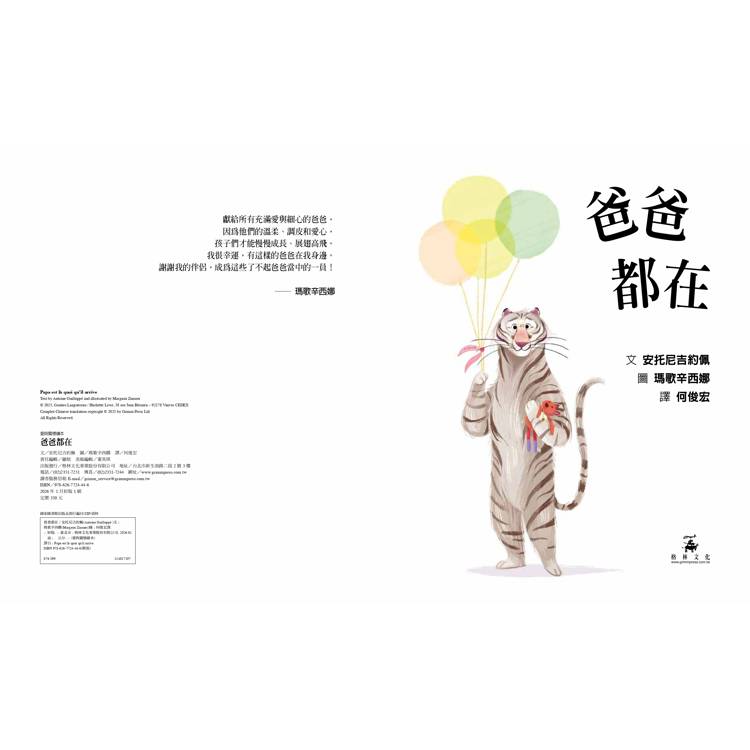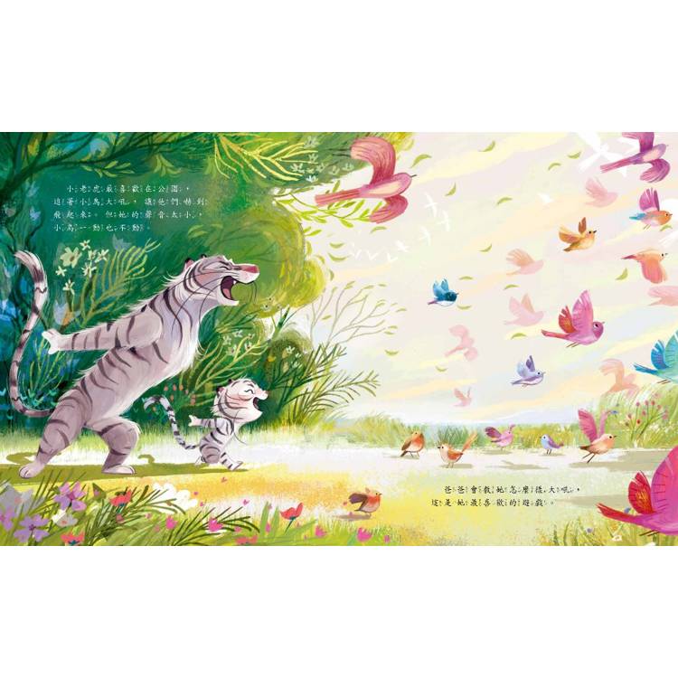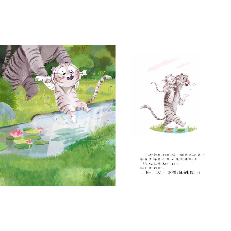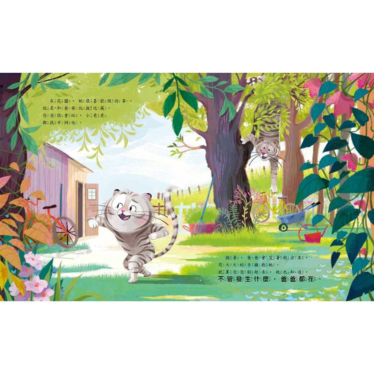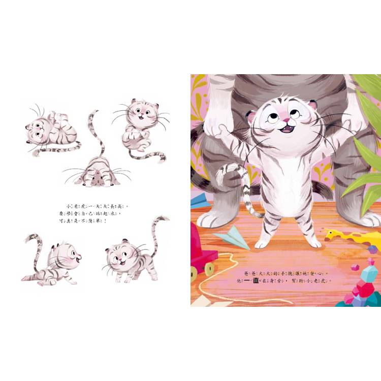 小老虎活潑又好動,長大好忙好忙!她要學走路、跳過大水坑,還要學會在媽媽上班時照顧自己。幸好,爸爸一直陪伴在她身邊,不管遇到什麼麻煩,不管小老虎是不是調皮搗蛋,他都會告訴小老虎:「爸爸一直都在。」這就像魔法咒語,讓小老虎安心,也讓她獲得克服恐懼的勇氣。