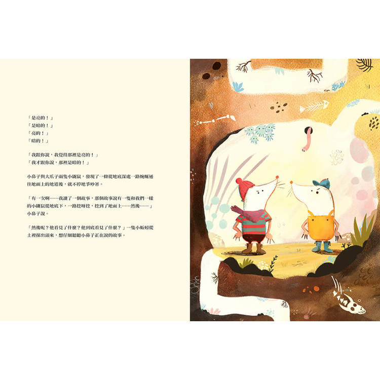 「有一次啊……我讀了一個故事,那個故事說有一隻和我們一樣的小鼴鼠從地底下,一路挖呀挖,挖到了地面上……然後……」小鼻子說。