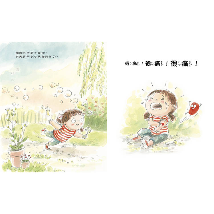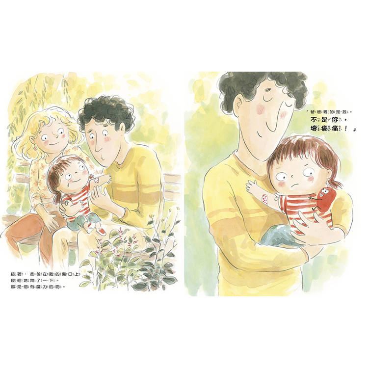 小女孩跌倒受傷了,手上有了一個很痛的傷口。媽媽第一時間飛奔過來幫她消毒、貼上OK蹦,安慰她還好不嚴重。爸爸很疼惜地在她的傷口上親吻了一下。哥哥為她念了她最愛的故事書。乾爸帶她吃冰淇淋、奶奶摘新鮮的草莓給她吃,爺爺帶著她一起做蛋糕,好朋友來陪她玩,甚至連家裡的狗狗都跑過來溫柔地舔了舔她的臉頰,雙眼望著她,好像是在說:「我把妳的痛痛趕走了。」……身邊所有人都以各自的方式安慰她,讓她忘記了跌倒受傷的痛。