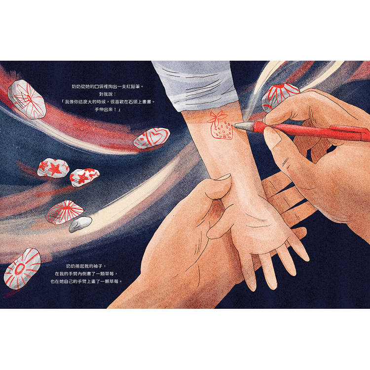 奶奶想到一個安慰孩子的方法。奶奶用紅鉛筆在自己和孩子手臂上畫了爺爺生前栽種的草莓,草莓象徵的是對爺爺的思念及悲傷。洗澡洗掉了草莓,再畫;游泳游掉了草莓,再畫。手臂上的草莓第一次不見時,孩子哭了。第二次掉了,他知道奶奶會再幫他畫上草莓,不哭了。隨著時間的流逝,直到有一天,祖孫兩人不再那麼在意一定要畫上草莓了。他們到爺爺的花園,採了真正的草莓,想起以前和爺爺一起採草莓的過往。奶奶和小孫子,笑著想念爺爺。同時,一起照顧爺爺生前最愛的草莓花園……