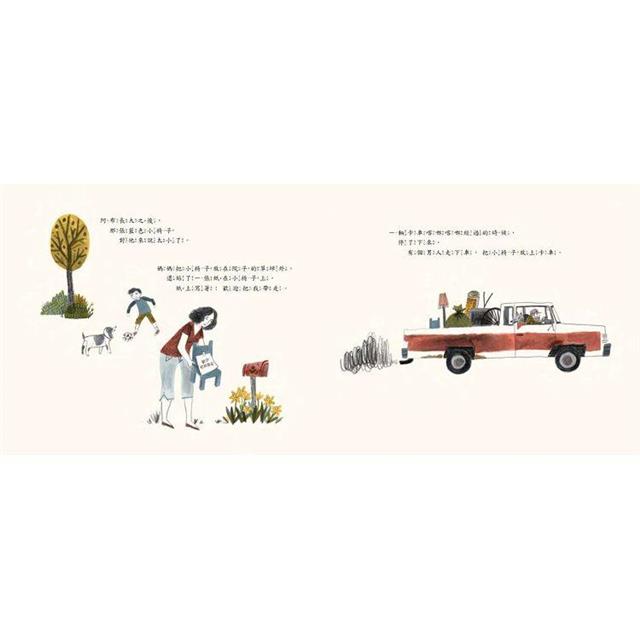 另外,此書的節奏安排還有一個特別加分之處——小椅子的每一段旅程都固定以兩個跨頁的篇幅推進,每翻過兩頁,就有一次轉折。讀者會在穩穩的節奏之中,參與小椅子的經歷,接著,再為下一場未知的旅程揭開序幕。可預期的節奏乘以不可預期的情節發展,讓故事加倍好看。