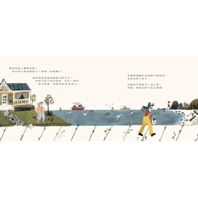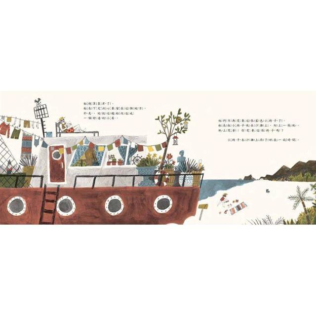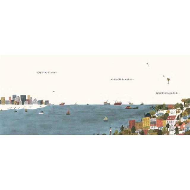 在這樣的閱讀節奏之後,故事的尾聲則是以四個跨頁呈現,最後一個驚喜是個大驚喜,以雙倍於之前的篇幅來慢慢說,有曲終漸緩的餘韻。藍色小椅子的漂浪之旅不僅限於陸地,還曾橫渡海航、飛越天際,它一度變成紅色小椅子,至此,又再回到原本的模樣,而且,這次的相遇,其實是久別重逢,是千山萬水之後的重逢。