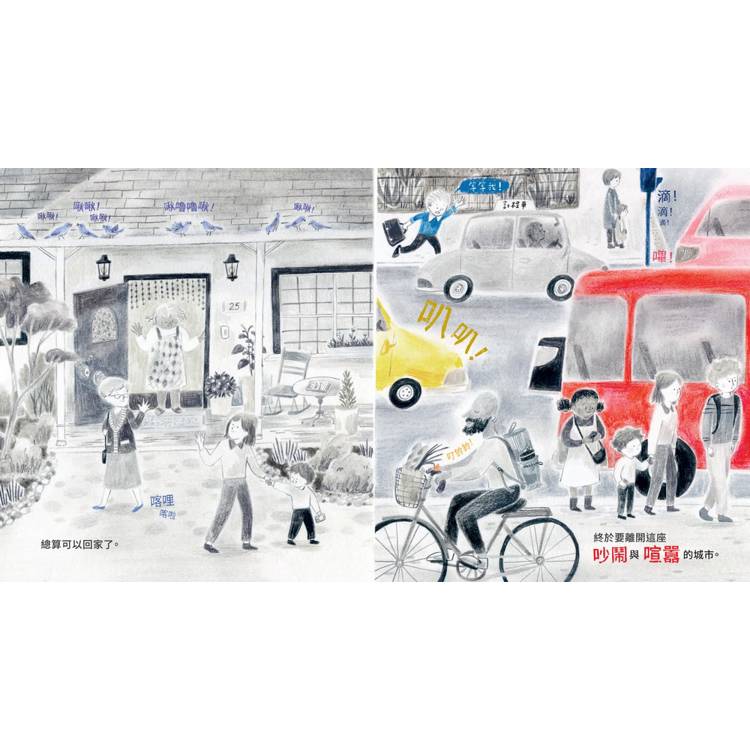 以色彩結合豐富的擬音詞,生動演繹動、植物的自然之姿。從最初大城市的繁忙嘈雜,到森林裡的飛蟲鳥獸、花草樹木、風聲、流水……萬籟鳴奏,運用想像力將視覺文字轉化成腦海中獨特的聽覺體驗。並鼓勵孩童暫時放下3C,親身探索周遭自然環境的樂趣。掃去一日煩悶的心情。