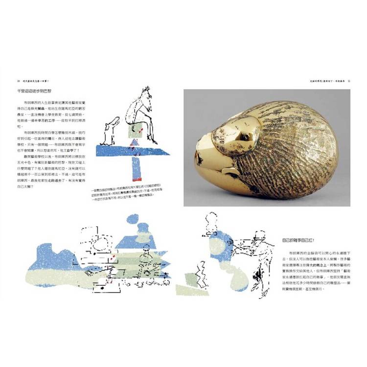 夏卡爾畫裡大到嚇人的雞、康丁斯基筆下長得像龍的搖搖馬、安納祖用幾千個瓶蓋做成不能睡的床罩……現代藝術是怎麼一回事?嘿!就讓我們用最簡單的方式,透過可愛的插圖、俏皮的文字,跟孩子一起在歡笑中探索三十件龐畢度中心裡精彩的現代藝術作品吧!──郭怡汝(「不務正業的博物館吧」 粉專主理人)