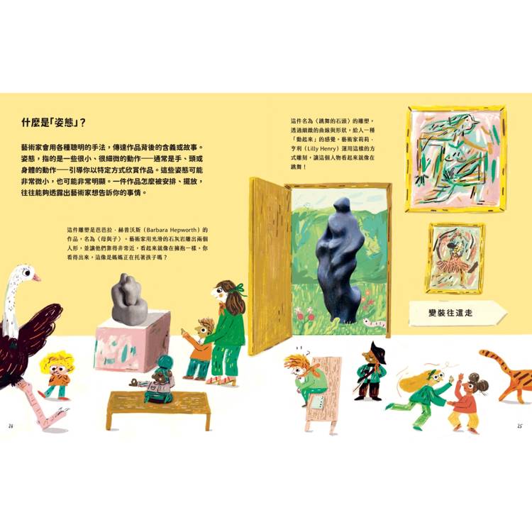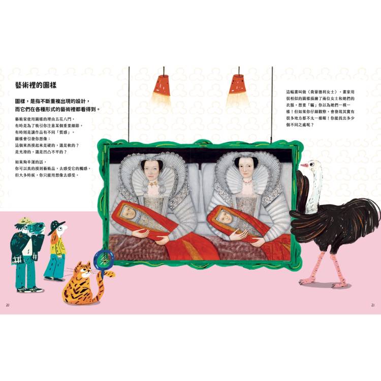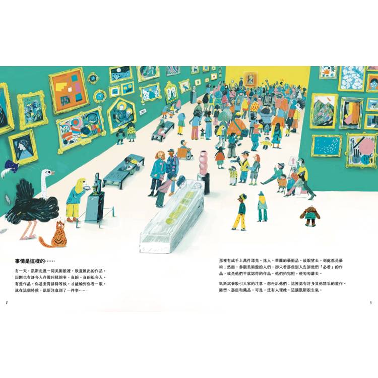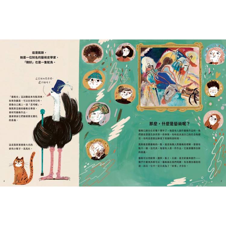 由鴕鳥藝術史學家「凱斯」與小幫手「馬馬杜」帶路。書中穿插提問,並強調欣賞與創作藝術沒有對錯,鼓勵孩子發揮想像力,建立自己的觀點。