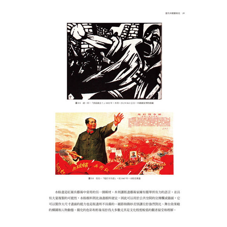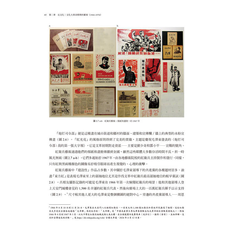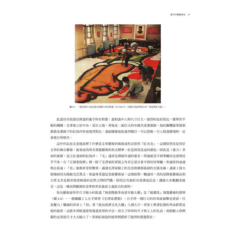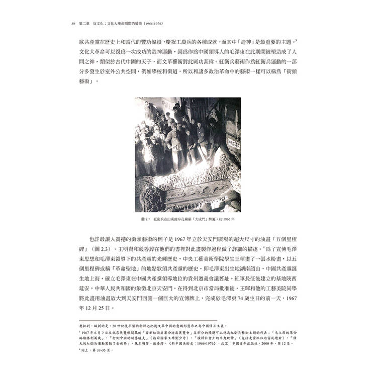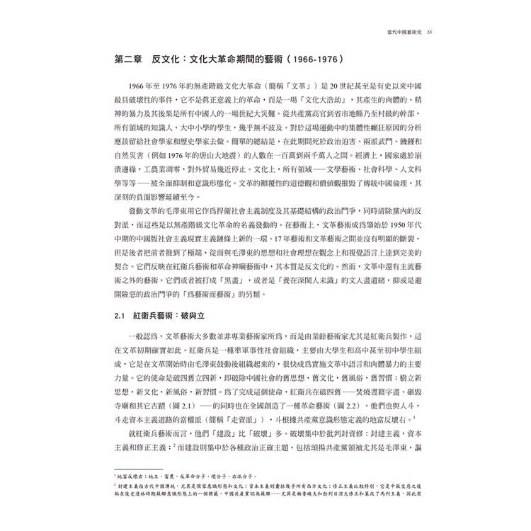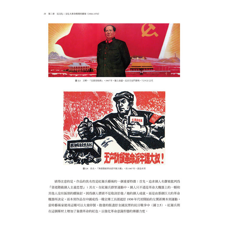 第二章討論文革時期的藝術。這個時期將中國版的社會主義現實主義推到了極端的紅衛兵藝術和精緻化的、政治的廟堂藝術,同時也有不同於這種主流藝術的另類藝術在此動蕩時期的堅持。