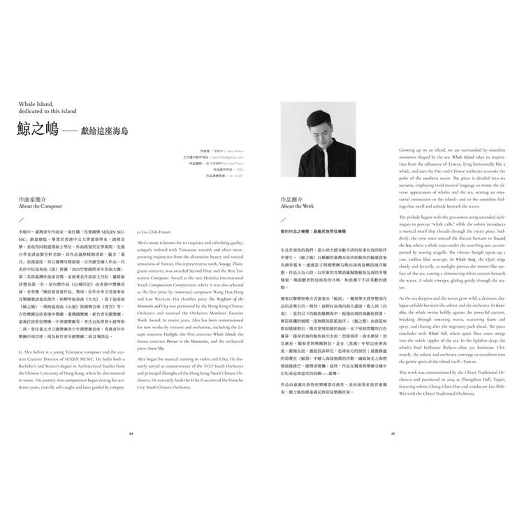 先進國樂特別啟動「臺灣作曲家樂譜系列出版計畫」,收錄多位優秀臺灣年輕作曲家作品。為了推廣考量,協奏作品並特別邀請作曲家編寫鋼琴縮編譜;裝幀設計上,更特別考量演奏需求,將鋼琴伴奏與獨奏譜分冊獨立,並力邀平面設計師賴佳韋操刀,以洗鍊的設計語彙結合臺灣元素,賦予樂譜專業、實用與收藏的價值,讓更多新銳之聲被看見,並持續為臺灣國樂注入活力。