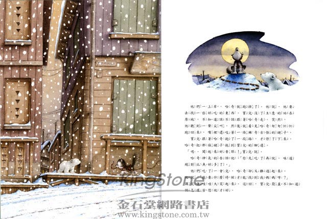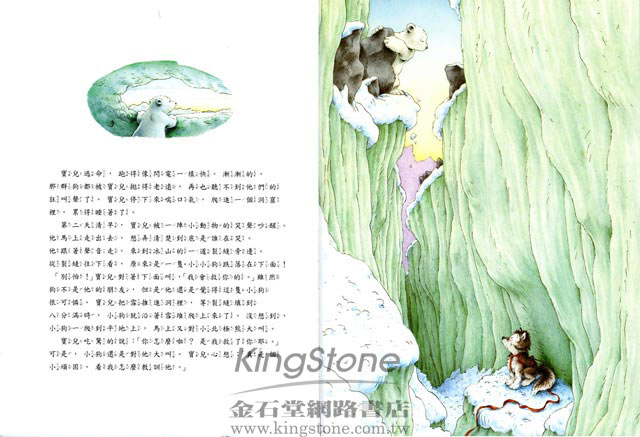 第二天,他又碰到一隻狗,不過是一隻小小狗,而且還掉在冰洞裡。小狗好害怕,希望寶兒不要丟下他一個,並且能幫助他找到爸爸媽媽,它們一路互相幫助˙˙˙˙˙這一次又會有什麼新鮮的事情發生呢?