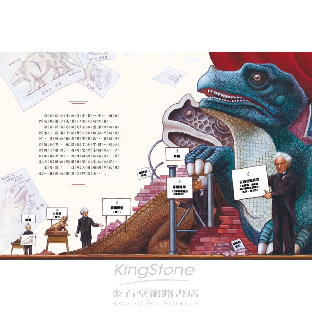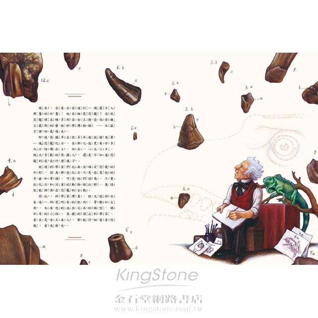 他和科學家理查.歐文合作,利用出土的恐龍化石,比對當今的生物,拼湊出恐龍的全貌。