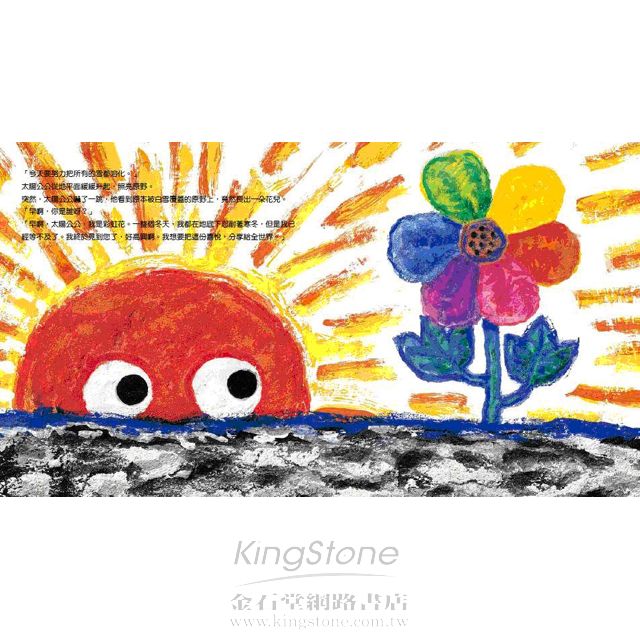 再次的冬去春來,太陽公公又見到彩虹花!瞧,他還嚇到鬥雞眼呢!生生不息的生命循環,讓人愉悅的圓滿結局,為讀者帶來了正面積極的人生觀與永恆的價值。