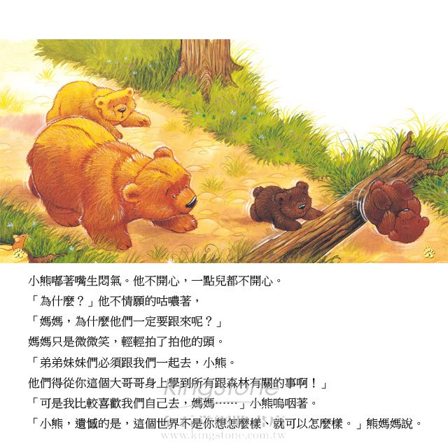 小熊雖然覺得弟弟妹妹們很頑皮、愛作弄他,又不能陪他玩,他一點也不喜歡這樣。但是當小熊發現小小熊們不見時,卻是那樣的焦急。誰說小熊不愛調皮搗蛋的小小熊呢?