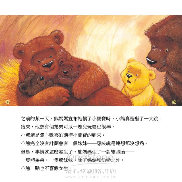 小熊一點兒都不開心。他本來以為有了弟弟,就可以陪也一起玩耍、一起做些「男孩子的事」。但是,媽媽生了雙胞胎,他突然多出了個妹妹,更糟糕的是,弟弟不但沒有陪他玩耍,還和妹妹連合起來老是作弄他。
