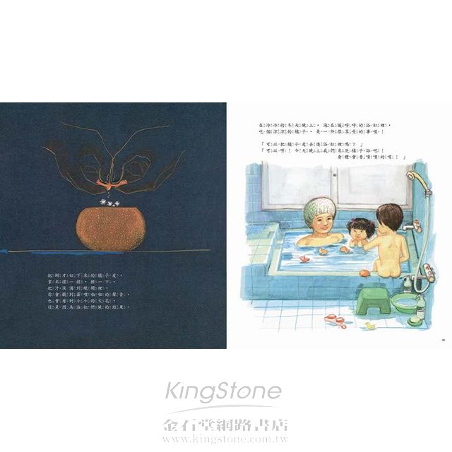 這一顆橘子不但好吃也很好看......令人意外的是-它竟然也是一個好玩的水果. 作者突發奇想地藉由切橘子的不同方式.娓娓道出橘子的直切面.橫切面..蒂頭下的圓點代表瓣數....橘子汁寫信...橘子燈....橘子浴.....太妙啦.